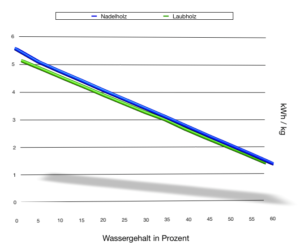 Der Heizwert ist aber auch abhängig vom Wassergehalt des Holzes. Frisch geschlagenes Holz kann aus 50% oder mehr des eigenen Gewichts aus Wasser bestehen. Verbrennt man nasses Holz, muss das Wasser erst herausgekocht werden, bevor die eigentliche Verbrennung des Holzes beginnen kann. Zum einen sinkt durch die verminderte Brenntemperatur deutlich der Heizwert, zum anderen kann das Holz nicht vollständig verbrannt werden, was eine vermehrte Rußbildung zur Folge hat. Außerdem können die Holzgase unverbrannt in die Atmosphäre gelangen. Neben einer unwirtschaftlichen Verbrennung trägt dies auch zur Umweltverschmutzung bei. Erst bei einem Wassergehalt von unter 22% kann man von einem trockenen – genauer: lufttrockenen Holz sprechen. Der Endpunkt der natürlichen Trocknung liegt bei 15% Wassergehalt. Absolut trockenes Holz (atro) ist nur durch technische Trocknung möglich.